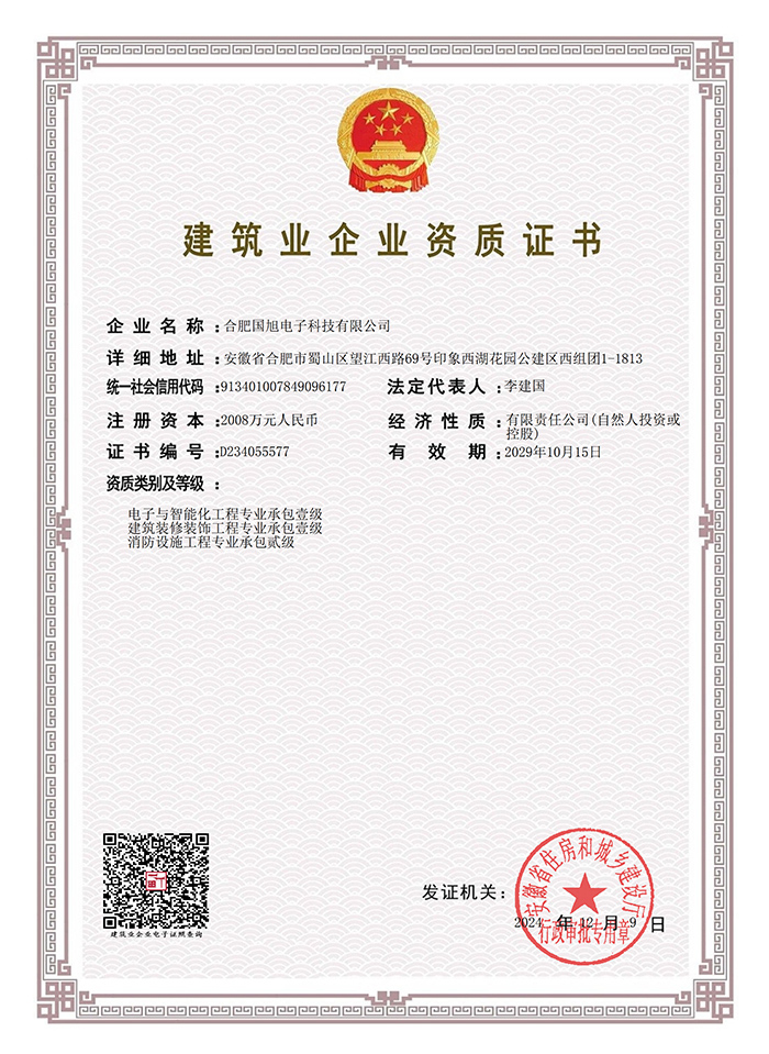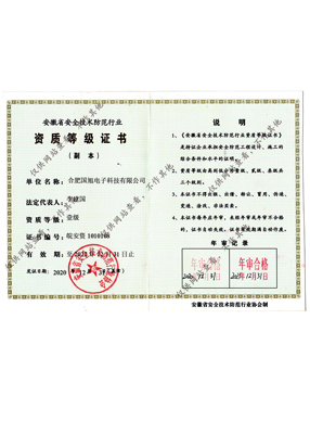 公司現(xiàn)已獲得承裝(修、試)電力設(shè)施許可證、電子與智能化工程專業(yè)承包壹級(jí)資質(zhì)、建筑裝修裝飾工程專業(yè)承包壹級(jí)資質(zhì)、消防設(shè)施工程專業(yè)承包貳級(jí)、安全技術(shù)防范行業(yè)壹級(jí)資質(zhì)、雷電防護(hù)裝置檢測(cè)資質(zhì)證乙級(jí)資質(zhì)、安全生產(chǎn)許可證、通過ISO9001:2015質(zhì)量管理體系認(rèn)證、ISO14001:2015環(huán)境管理體系認(rèn)證、OHSAS18001:2007職業(yè)健康安全管理體系認(rèn)證等榮譽(yù)。我們還將進(jìn)一步努力,爭取贏得更多的榮譽(yù)。